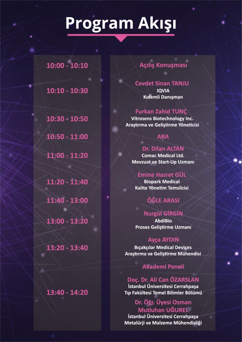 Günün sonunda gerçekleşecek Akademik Panelde ise Doç. Dr. Ali Can Özarslan (İÜC Metalürji ve Malzeme Müh.) ve Dr. Öğr. Üyesi Osman M. Uğurel (İÜC Tıp Fakültesi Temel Bilimler) bizlerle olacaktır.