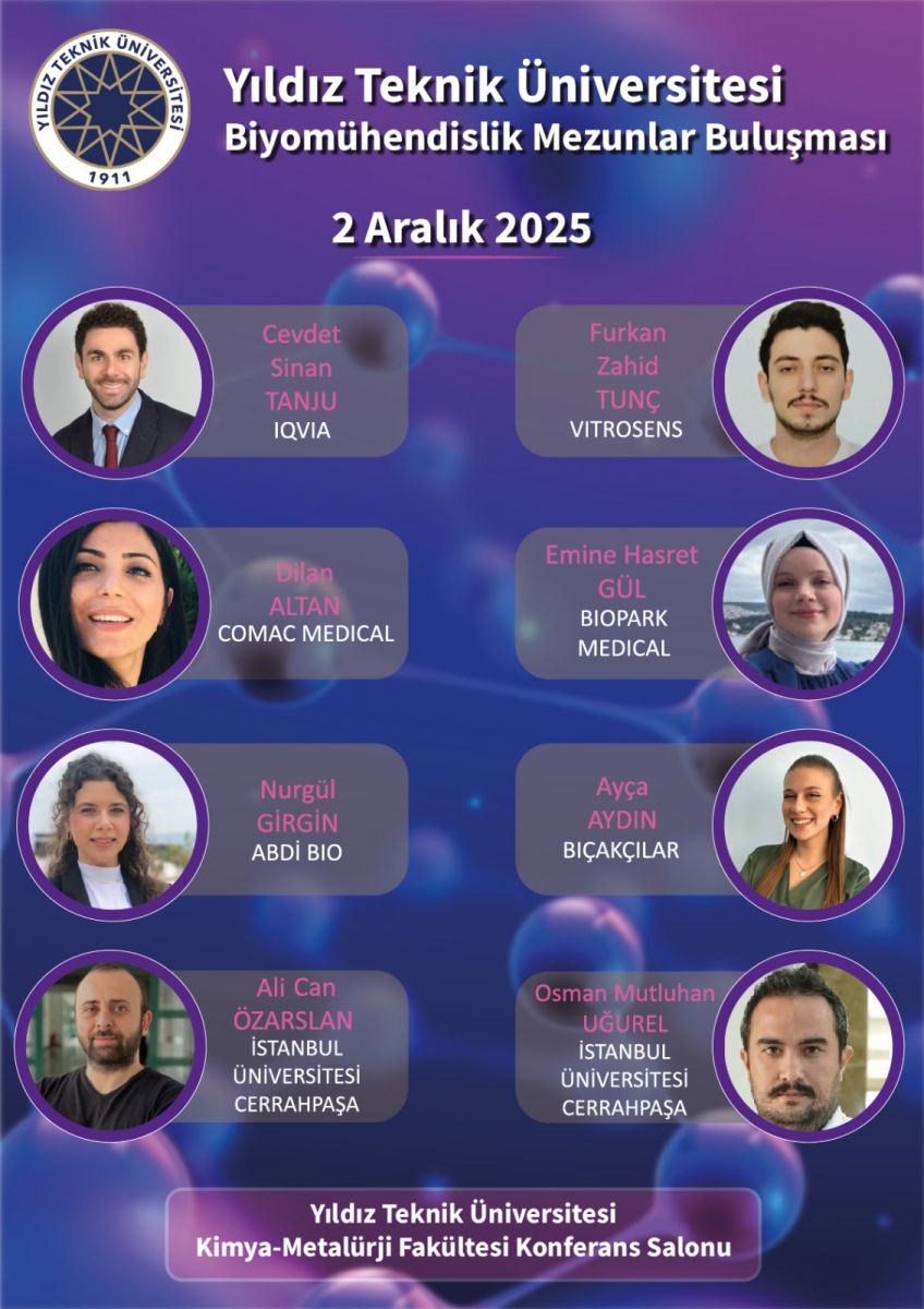 Yıldız Teknik Üniversitesi Biyomühendislik Bölümü olarak, mezunlarımızla bağlarımızı güçlendirmek ve sektördeki güncel gelişmeleri ele almak adına 2 Aralık 2025 tarihinde "Mezunlar Buluşması" gerçekleştiriyoruz.